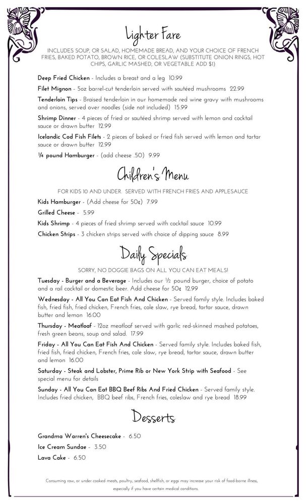 All you can eat fried chicken, baked fish and fried fish. Served with homemade coleslaw, tartar sauce, French fries and rye bread served family style.