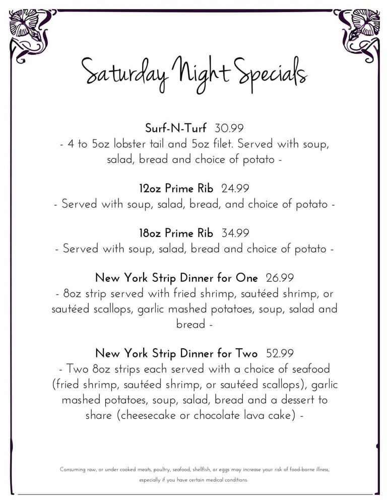 Served with sautéed scallops, fried shrimp or sautéed shrimp and garlic mashed potatoes. Choice of soup or salad and a dessert to share.